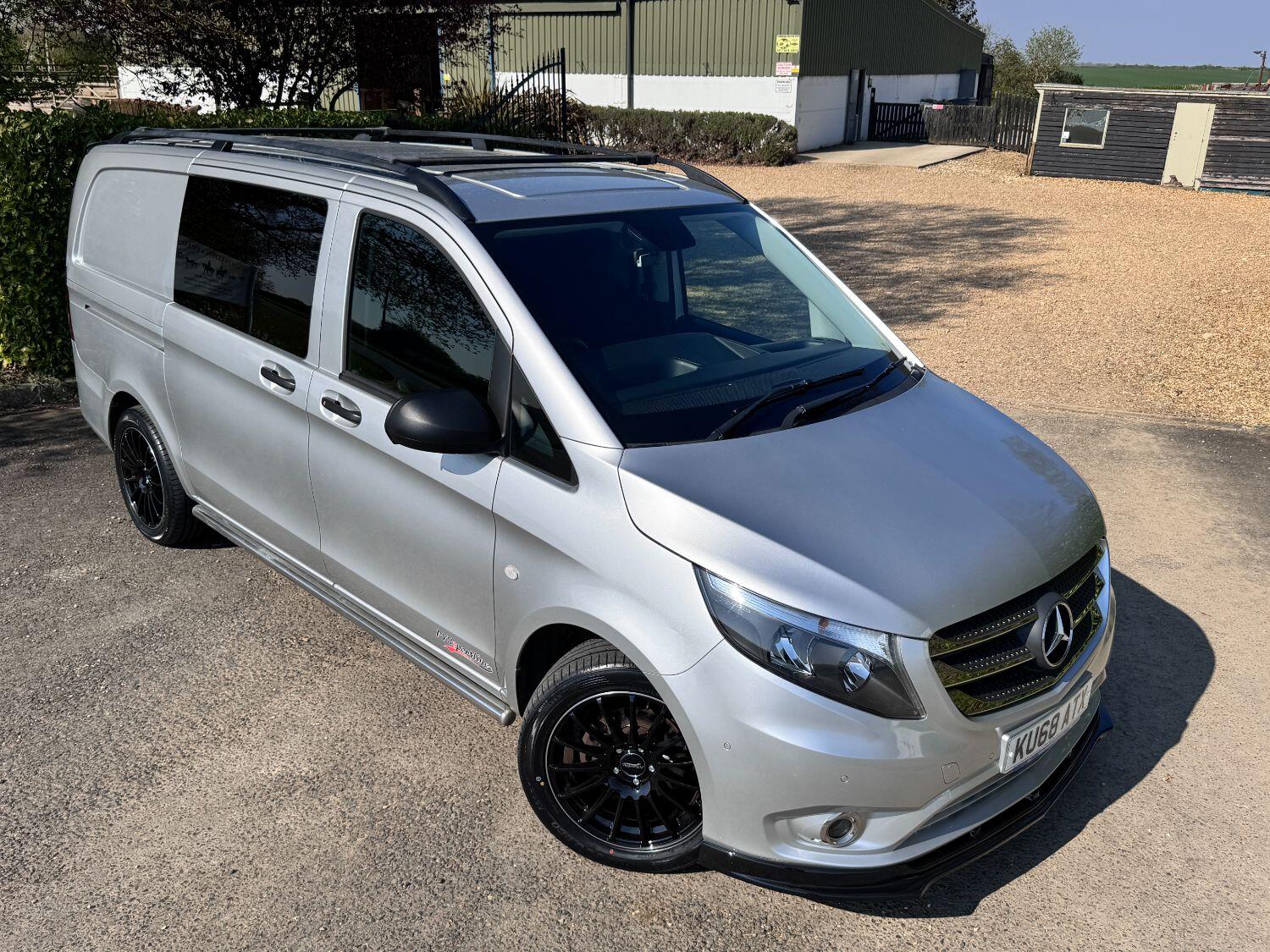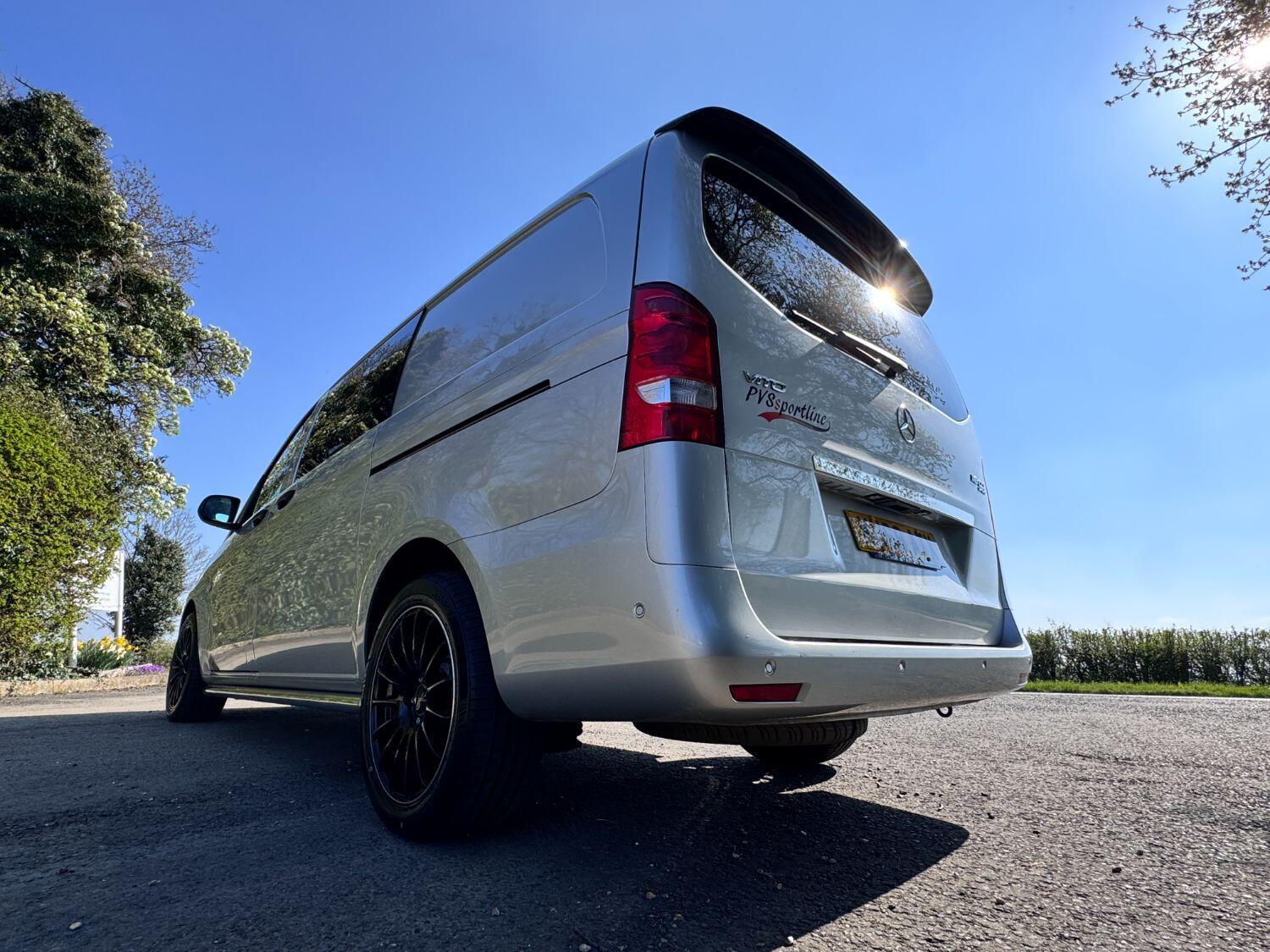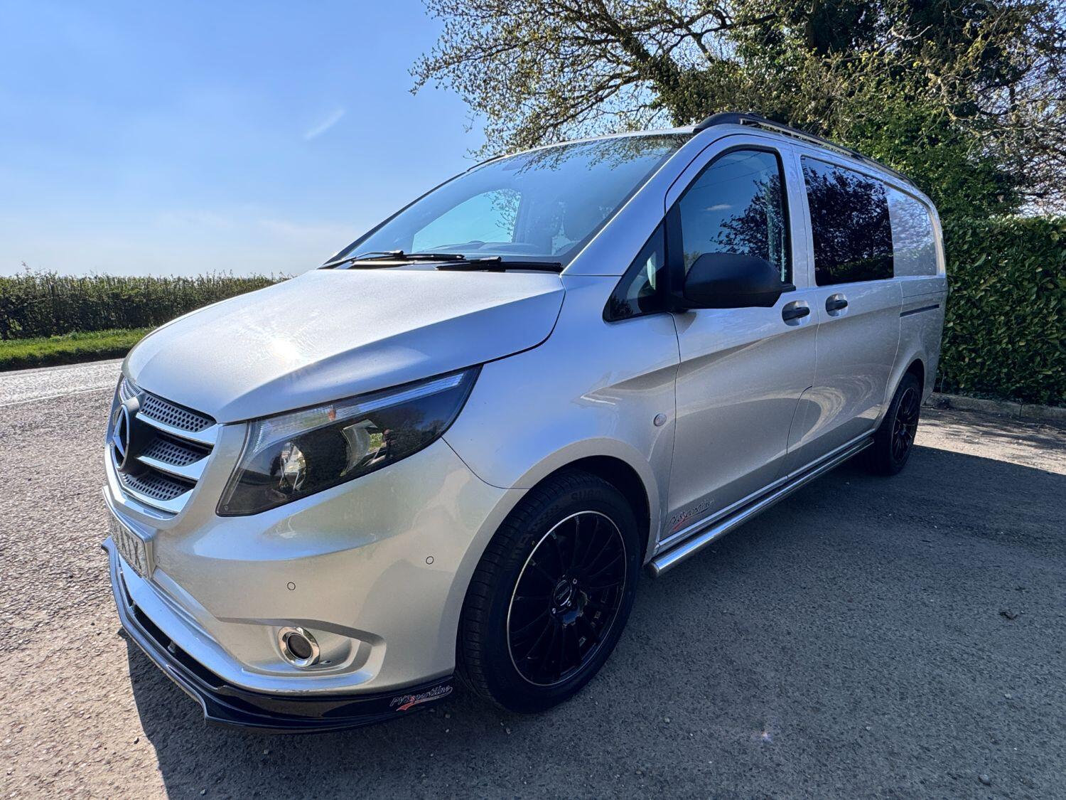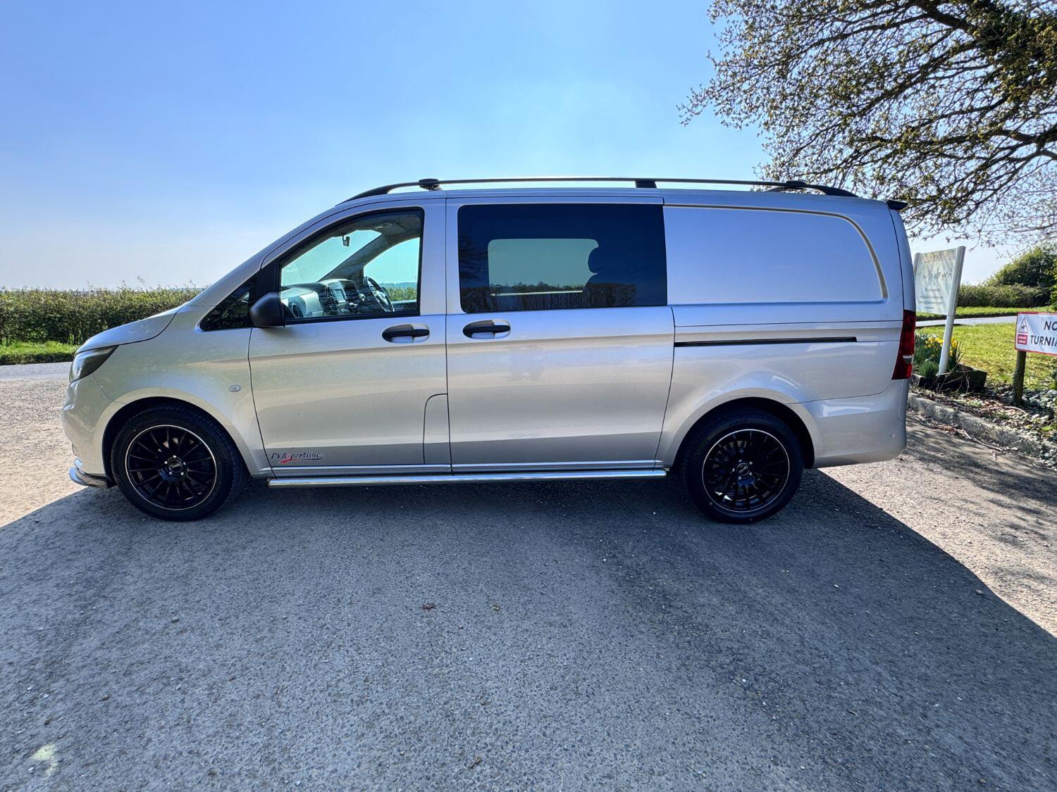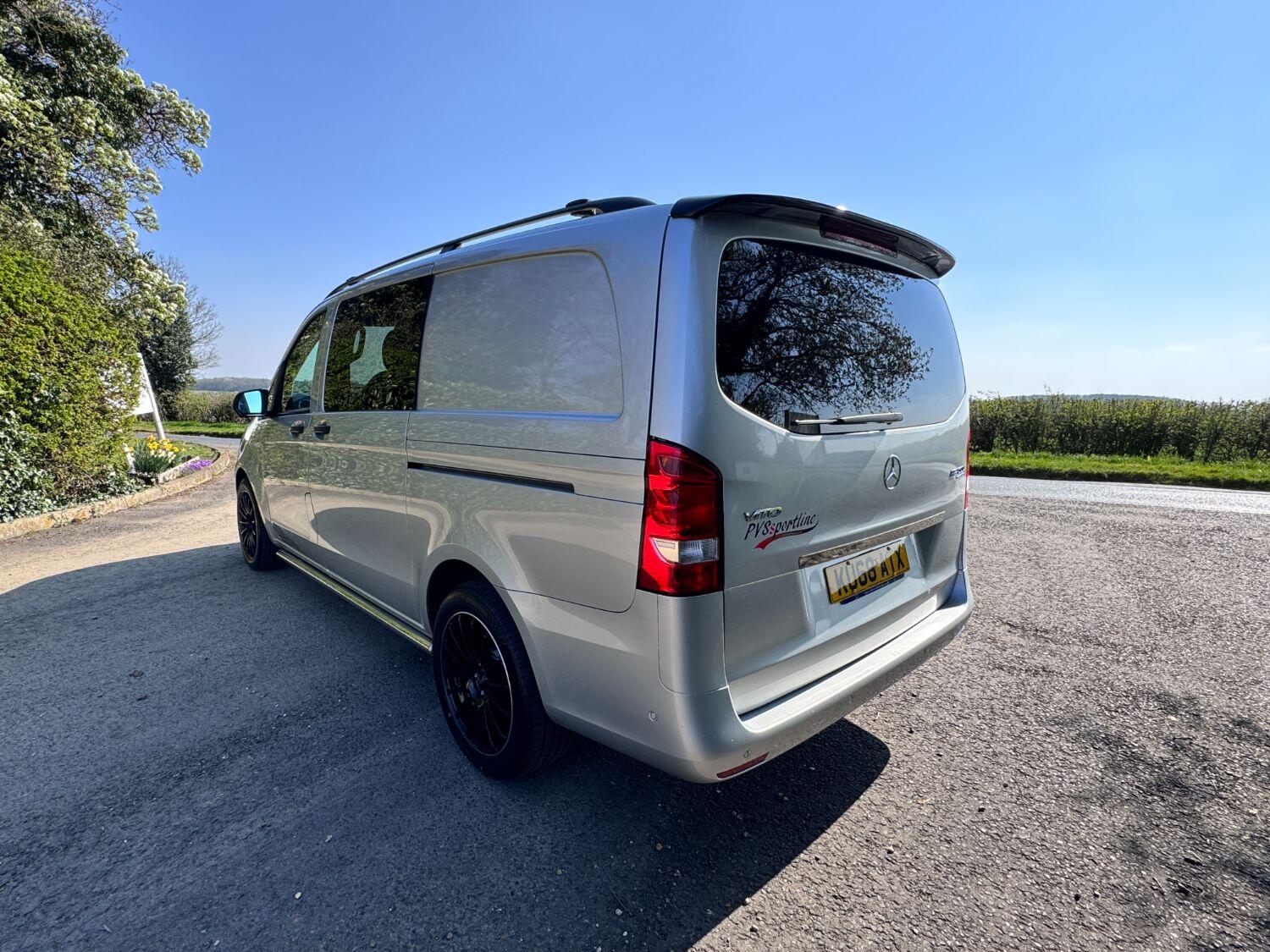 Welcome to our exceptional 2018 Vito Sport Crew Cab Van PVSsportline, a stylish and practical multi use vehicle, Benefiting From Our PVSsportline Upgrades: Brand New 18" Gloss Black Alloy Wheel & Tyre Package, Front Splitter and Rear Spoiler, Presented in Brilliant Silver, with Mercedes and 1 company owner from new powered by Mercedes trusted 2.1L diesel engine, running through G-Tronic+ automatic transmission, providing a smooth and efficient driving experience. With premium Sport trim features Including: Air Conditioning, cruise control, reverse assist camera, front/rear parking sensors with indicators, bluetooth connectivity, exterior pack including 17" alloy wheels, chrome side bars, colour coded bumpers 7 side trim, rear tailgate + MUCH MORE