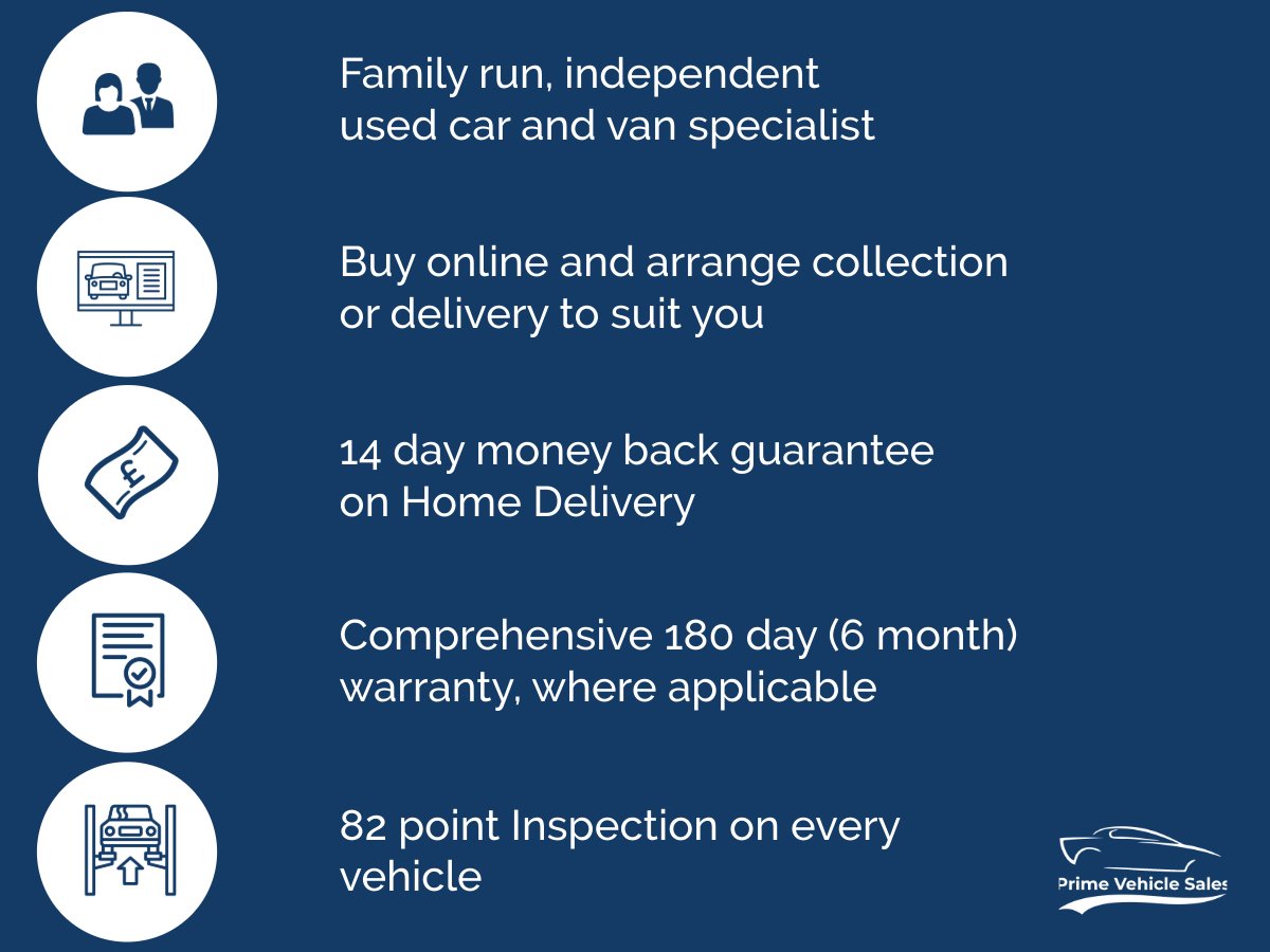 Fantastic part exchange deals, and competitive Finance rates available through Our Finance Partner. Debit card payment facilities available Prime Vehicle Sales offer all their vehicles with: HPI check to confirm their history before entering our forecourt, and a certificate will be provided Upon, Collection.Our vehicles are given a full safety check. Where applicable independent 6 month extendable warranty included All our vehicles are given a premium valet service prior to collection.